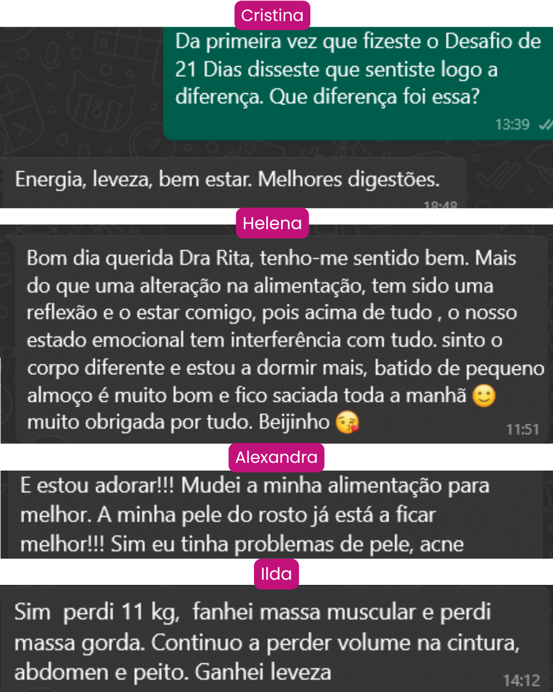 No 1º dia recebes uma lista de compras com apenas 4 itens, que até poderás ter em casa. Isto repete-se no início de cada semana. A partir daí, a cada dia abre uma nova aula com o desafio do dia, durante 21 dias. Terás perguntas de reflexão que vão trazer-te AUTOCONHECIMENTO sobre o impacto da alimentação no teu corpo, mente e emoções.